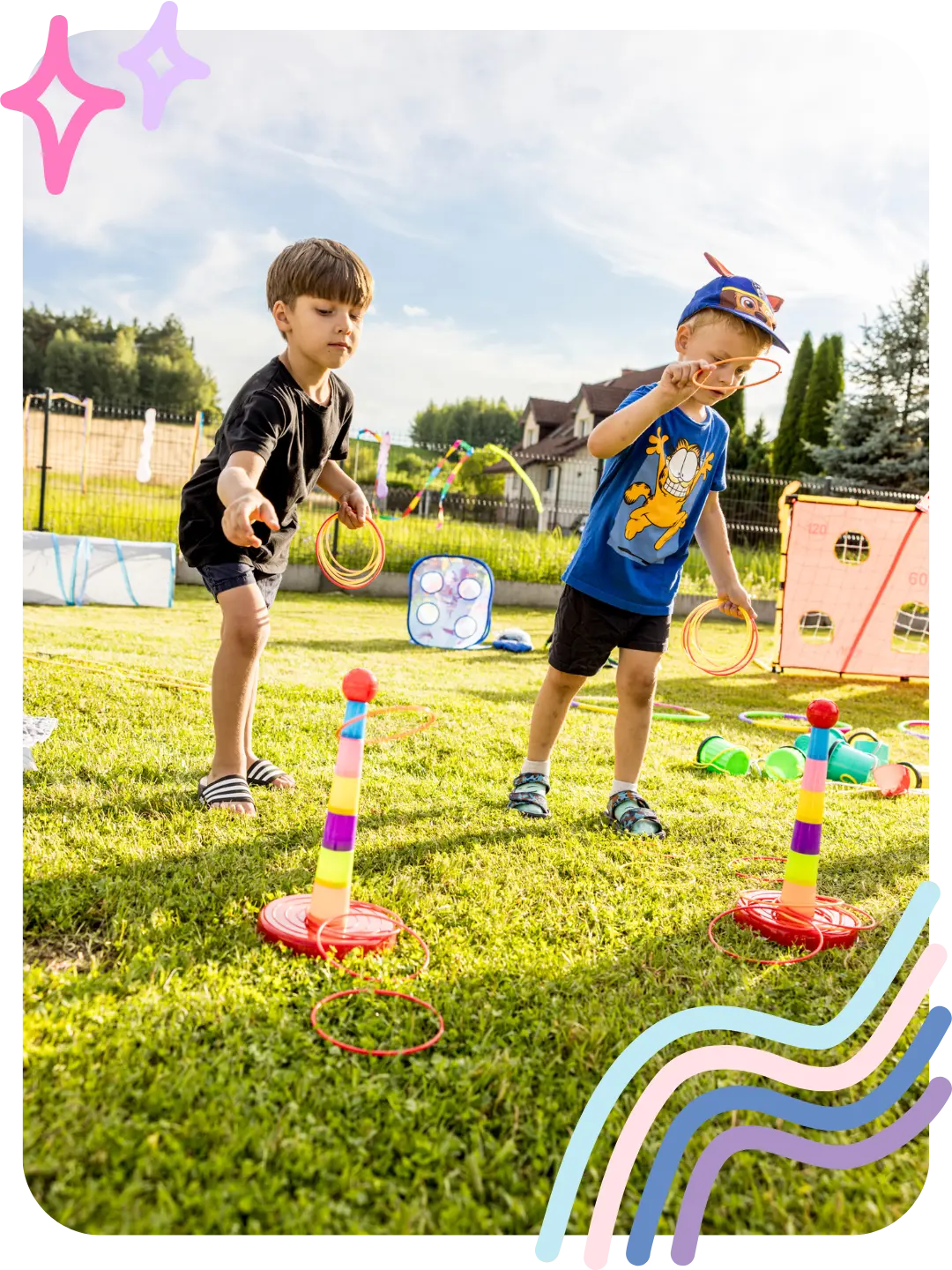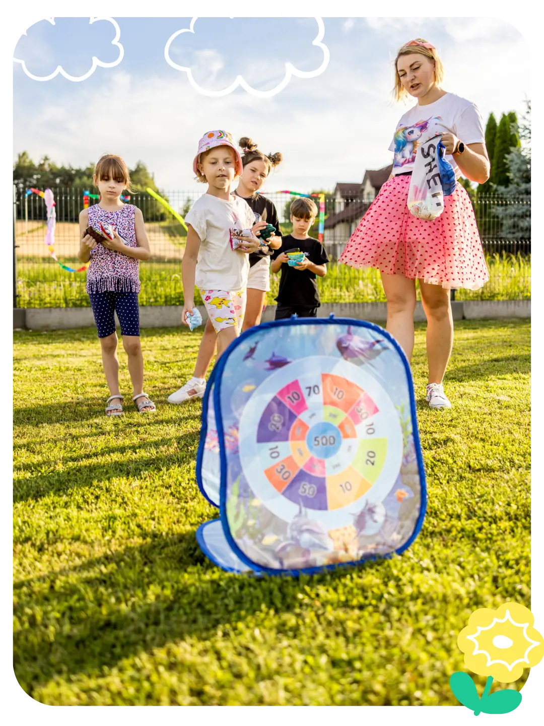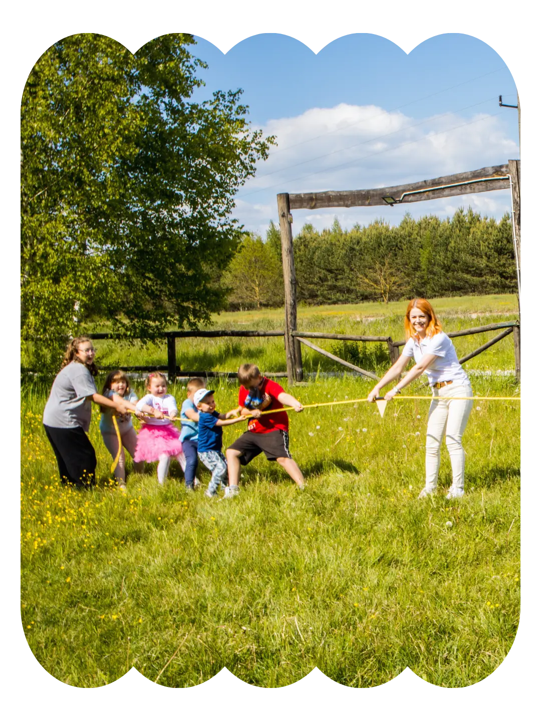 Przeciąganie liny, rzuty do celu, szczudła, tory przeszkód i wiele więcej aktywnych zabaw i konkurencji dobieranych do energii grupy i dostępnej przestrzeni.